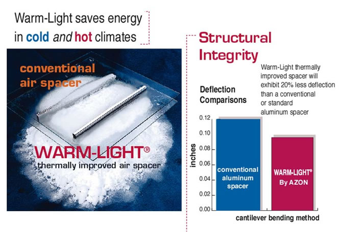 許多斷熱鋁隔條都定位于商業(yè)或民用,Warm-Light⑩ 在民用市場(chǎng)應(yīng)用良好,令人稱(chēng)奇的是它的性能多樣性使得它在商業(yè)領(lǐng)域也能有良好表現(xiàn)。Warm-Light⑩是僅有的幾種可以改善門(mén)窗整體結(jié)構(gòu)性能的技術(shù)。亞松已經(jīng)對(duì)Warm-Light⑩和一般商業(yè)建筑用的普通鋁隔條進(jìn)行測(cè)試。商業(yè)建筑的結(jié)構(gòu)要求和風(fēng)壓以及整個(gè)門(mén)窗的結(jié)構(gòu)穩(wěn)定性都要考慮,它們?cè)诒3纸ㄖY(jié)構(gòu)完整性同時(shí)還要經(jīng)得起檢驗(yàn)。由于繼承了AZON聚氨酯隔熱膠優(yōu)良的力學(xué)性能和傳統(tǒng)的槽鋁式設(shè)計(jì),使得AZON WARM-LIGHT硬性暖邊系統(tǒng)具有了良好的機(jī)械性能,是唯一一種可以適用于高層建筑門(mén)窗幕墻系統(tǒng)的中空玻璃暖邊系統(tǒng)。