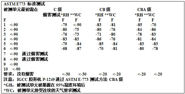 美國(guó)檢測(cè)和材料協(xié)會(huì)(ASTM)已經(jīng)為中空玻璃制定了統(tǒng)一標(biāo)準(zhǔn)尺寸、單位數(shù)量、檢測(cè)時(shí)間和性能要求。ASTM E773是一種檢測(cè)密封條的耐用性的標(biāo)準(zhǔn)。ASTM E774是根據(jù)在各種氣候條件下檢測(cè)的耐用性將中空玻璃分成三種。當(dāng)各種循環(huán)的數(shù)字出來(lái)時(shí),把標(biāo)本移走結(jié)霜點(diǎn)就獲得了。標(biāo)本會(huì)被分成三類(lèi)Class C,Class CB,Class CBA,最后一種是最高等級(jí)。每個(gè)中空玻璃生產(chǎn)廠(chǎng)家都會(huì)做產(chǎn)品檢測(cè),Warm-light已在各種安裝形式下作了檢測(cè)并成功地獲得了CBA等級(jí)。