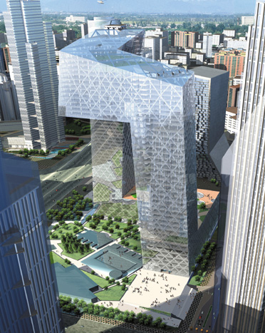 兩座豎立的塔樓雙向傾斜6度,在162米高處被14層高的懸臂結構連接起來,兩段懸臂分別外伸67和75米,且沒有任何支撐,在空中合龍為L形空間網狀結構,總體形成一個閉合的環。