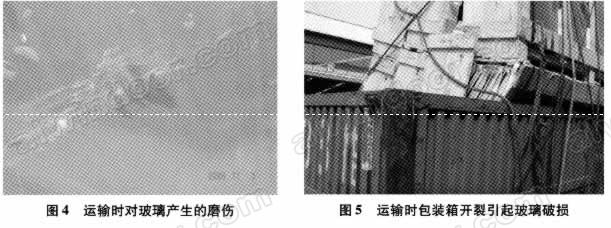 玻璃在生產、運輸和搬運時,如果對玻璃保護不當,會對玻璃表面或邊部產生嚴重的劃傷,爆邊,磨傷等缺陷,也會造成玻璃局部的應力集中。引起玻璃破損。見圖4.圖5
