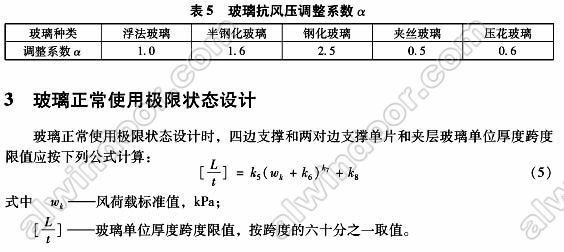 鋼化夾層玻璃和鋼化夾層玻璃最大許用跨度時,可按表4中普通夾層玻璃采用相應系數。風荷載設計值應除以抗風壓調整系數。抗風壓調整系數可按表5采用。