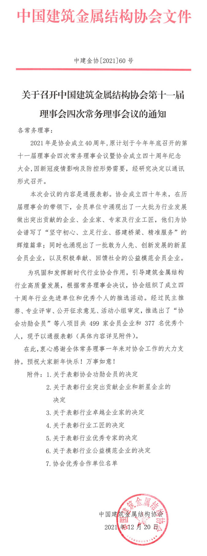 點擊下載附件:中國建筑金屬結構協會第十一屆理事會四次常務理事會議【附表彰名單】