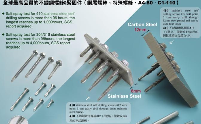 2、我司生產(chǎn)的410材質(zhì)#12鉆尾可以鉆6MM厚的鋼板,并且可以連續(xù)鉆3次,同時(shí)可以鉆304不銹鋼的鋼板5MM,#14可以鉆8MM厚板,技術(shù)遠(yuǎn)超國(guó)內(nèi)同行業(yè)水平。