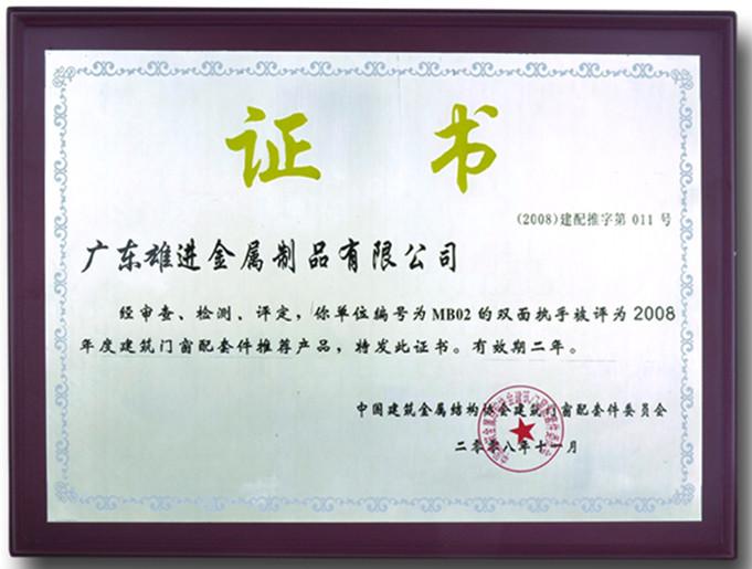 單位編號為MB02的雙面執手被評為2008年年度建筑門窗配套件推薦產品 |