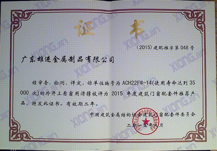 單位編號為ACH22F#-14的外開上懸窗用滑撐被評為2015年度建筑門窗配套件推薦產品 |
