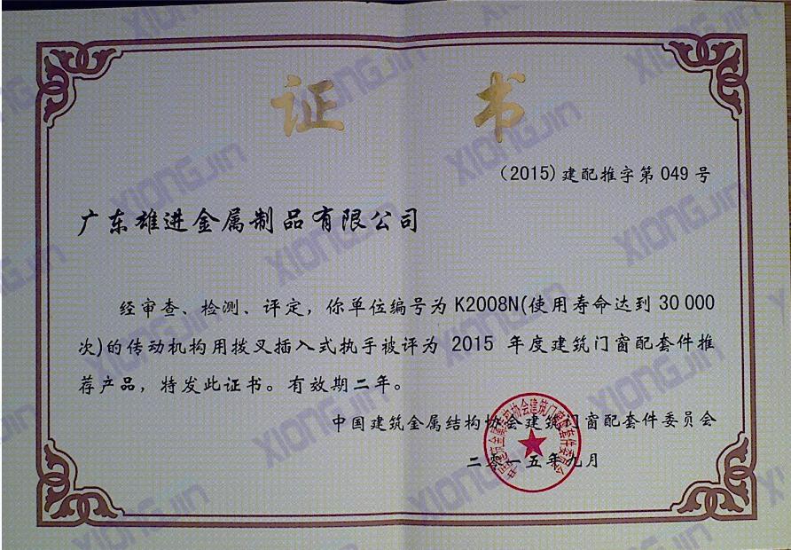 單位編號為K2008N的傳動機構用撥叉插入式執手被評為2015年度建筑門窗配套件推薦產品 |