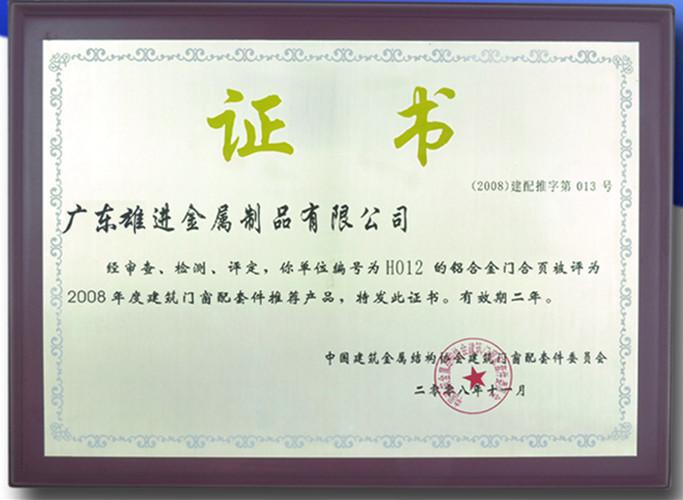 單位編號為H012的鋁合金門合頁被評為2008年度建筑門窗配套件推薦產品 |