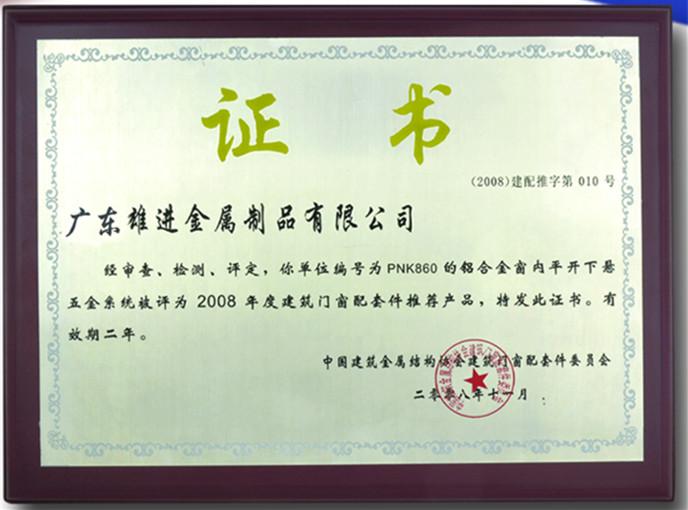 單位編號為PNK860的鋁合金窗內平開下懸五金系統被評為2008年度建筑門窗配套件推薦產品 |