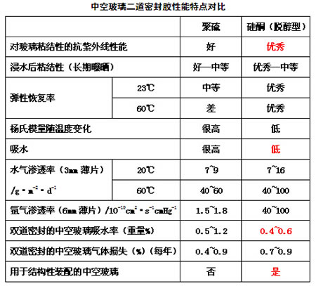 中空玻璃二道密封膠主要有聚硫和硅酮兩類,目前國內市場上以硅酮為主。下表中列出了兩種膠完全固化后的一些特性。