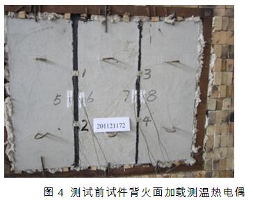 耐火試驗(yàn)時(shí),在C30混凝土板背火面、分別距離最大縫隙和最小縫隙邊緣25mm處各布置二支熱電偶,在防火膠背火面、分別在最大縫隙和最小縫隙中心線上各布置二支熱電偶,用以測(cè)定試件背火面溫度,見(jiàn)圖4。