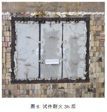 圖6為試件耐火3h后背火面的照片,由圖6可見(jiàn),試件耐火3h后膠縫完好,同時(shí)記錄了背火面最高溫升和背火面框架表面最高溫升。在爐內(nèi)溫度超過(guò)1100℃的條件下,被檢試樣背火面最高溫升79℃,背火面框架表面最高溫升92℃,成功阻火3h,并表現(xiàn)出優(yōu)異的隔熱性能。