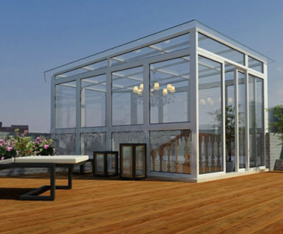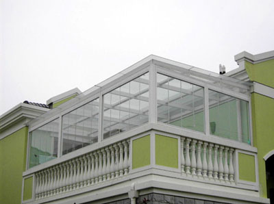 結構組成:立面采用單玻塑鋼門窗(或者雙玻塑鋼門窗), 頂面采用彩鋁方管框架結合8mm鋼化玻璃(或者5+5夾膠玻璃,5+5單面鋼化夾膠玻璃,5+5雙面鋼化夾膠玻璃)。