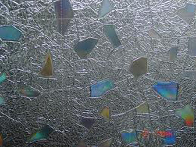 夾層在兩層玻璃中間,形成表面透明。但在光線的折射線,各種不同角度上看可呈現不同的顏色。圖案和視覺效果的特種玻璃,鐳射全息玻璃的問世。為裝潢材料、家具業的設計師們提供全新的選擇。鐳射全息膜分為個性化設計之圖案/LOGO/文字版及普通無圖版兩種。